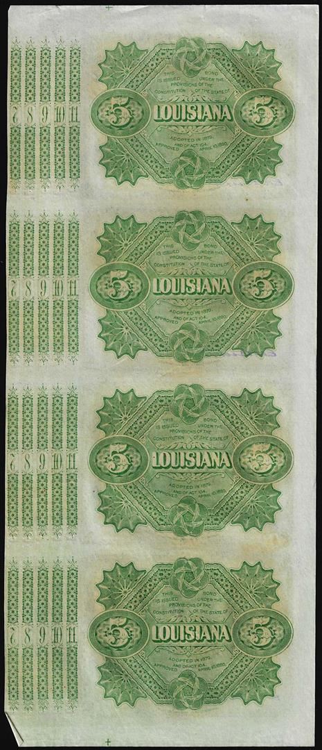 One Uncut Sheet of (4) State of Louisiana Baby Bond Obsolete Notes.