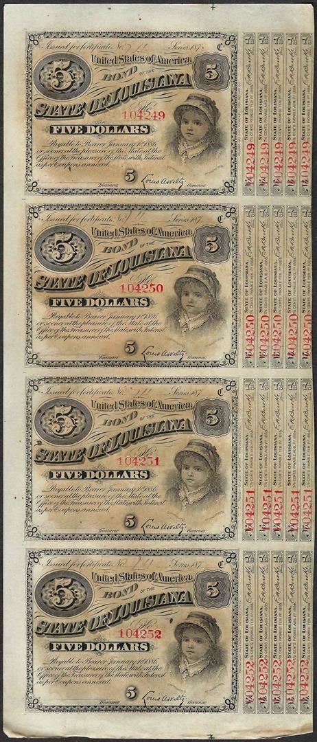 Uncut Sheet of (4) State of Louisiana Baby Bond Obsolete Notes