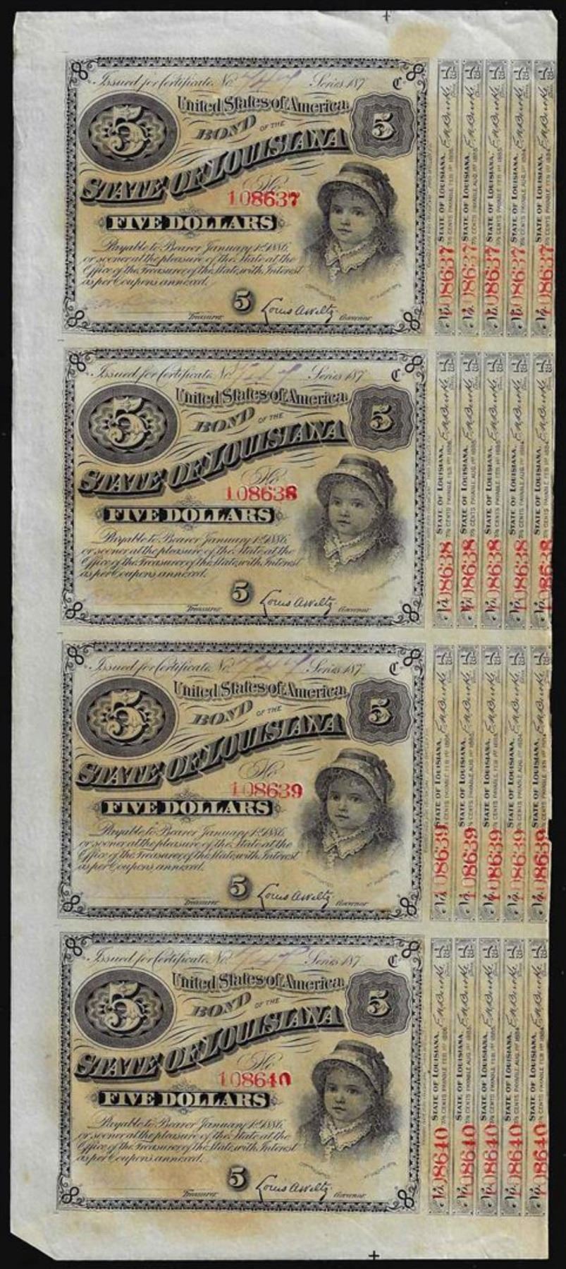 One Uncut Sheet of (4) State of Louisiana Baby Bond Obsolete Notes.