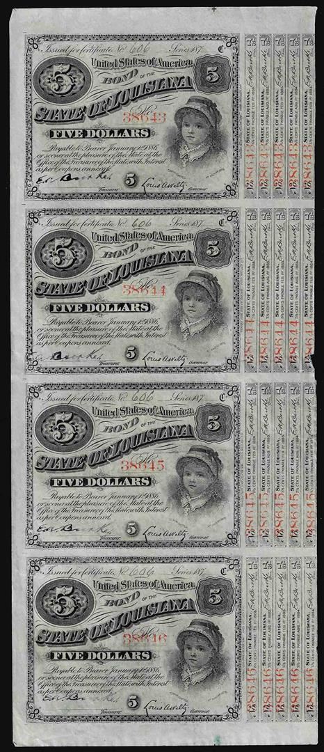 Uncut Sheet of (4) State of Louisiana Baby Bond Obsolete Notes