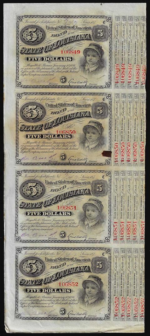 Uncut Sheet of (4) State of Louisiana Baby Bond Obsolete Notes