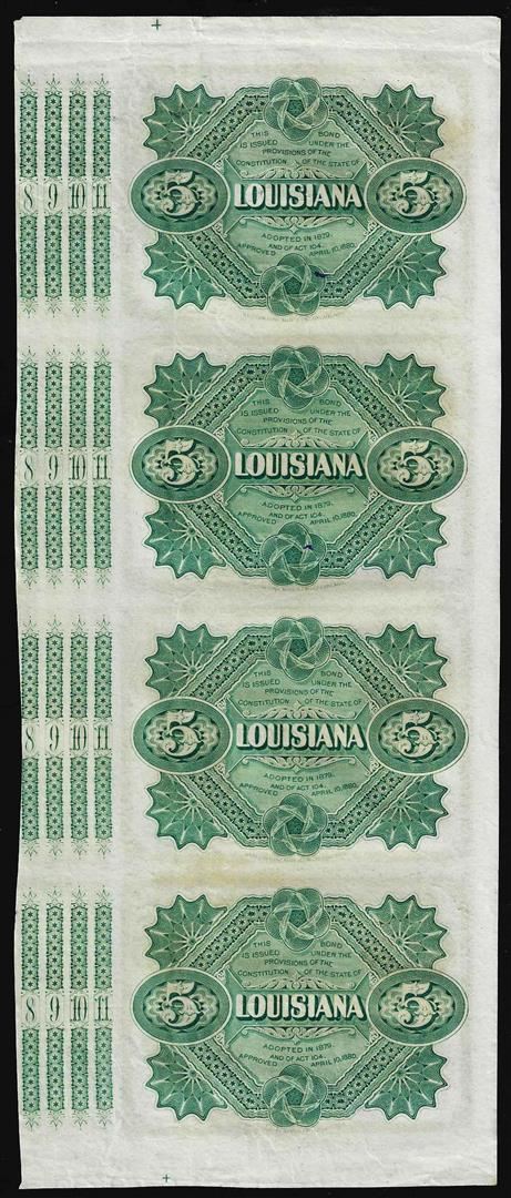 One Uncut Sheet of (4) State of Louisiana Baby Bond Obsolete Notes.