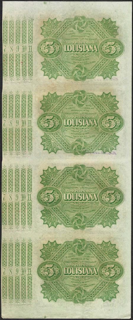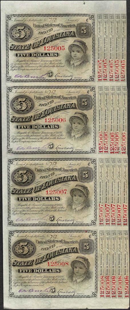 One Uncut Sheet of (4) State of Louisiana Baby Bond Obsolete Notes.