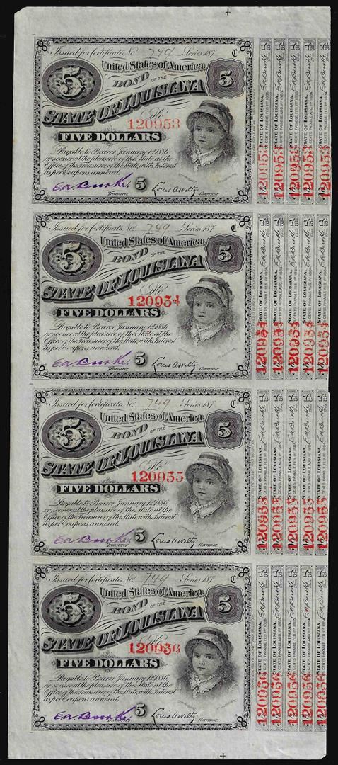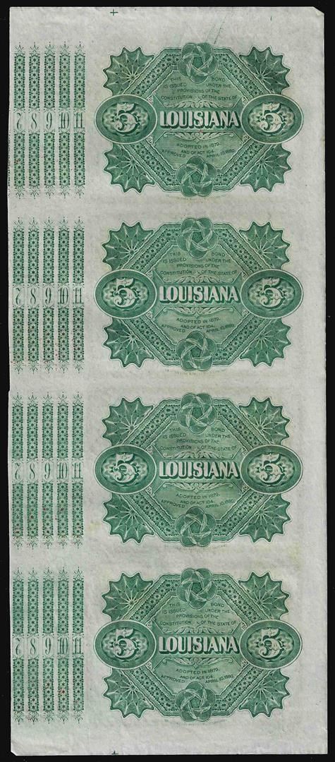 Uncut Sheet of (4) State of Louisiana Baby Bond Obsolete Notes