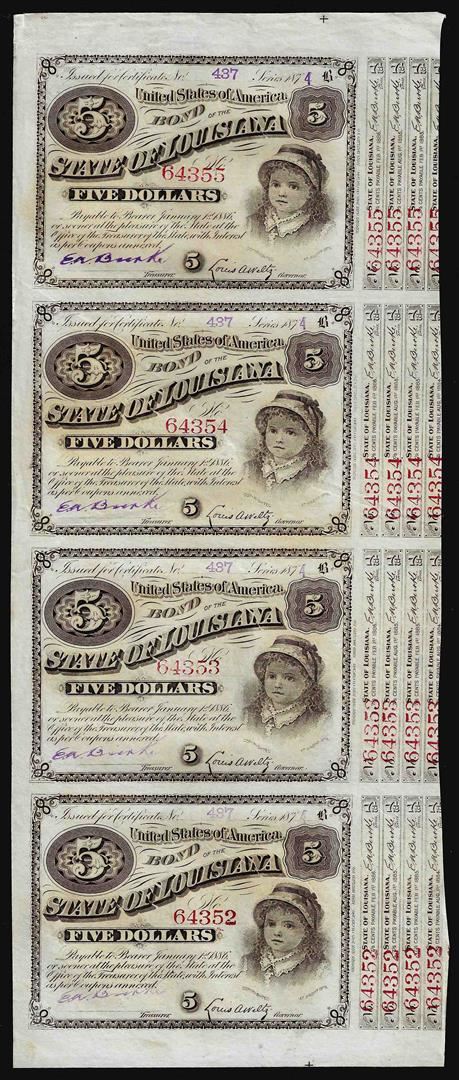 Uncut Sheet of (4) State of Louisiana Baby Bond Obsolete Notes