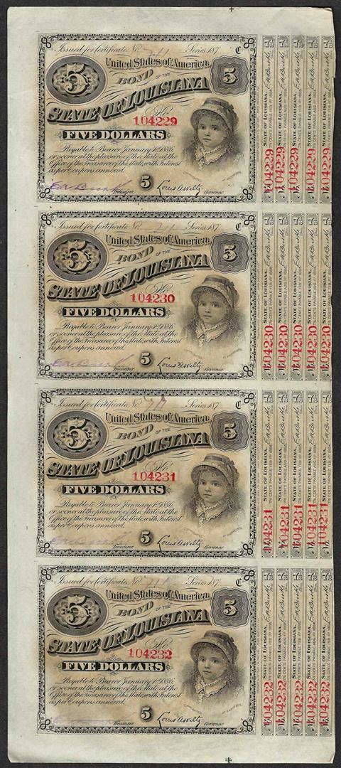 Uncut Sheet of (4) State of Louisiana Baby Bond Obsolete Notes