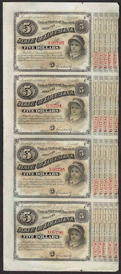 One Uncut Sheet of (4) State of Louisiana Baby Bond Obsolete Notes.