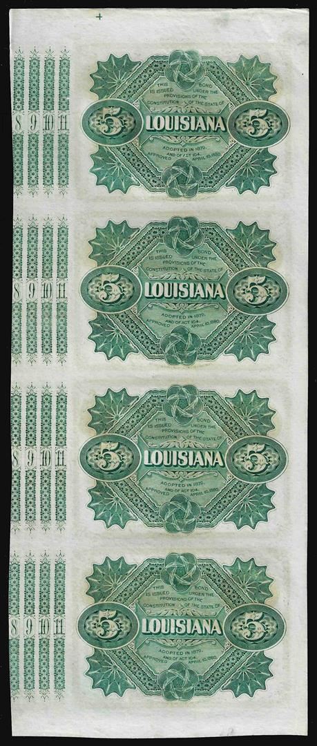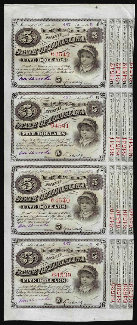 Uncut Sheet of (4) State of Louisiana Baby Bond Obsolete Notes