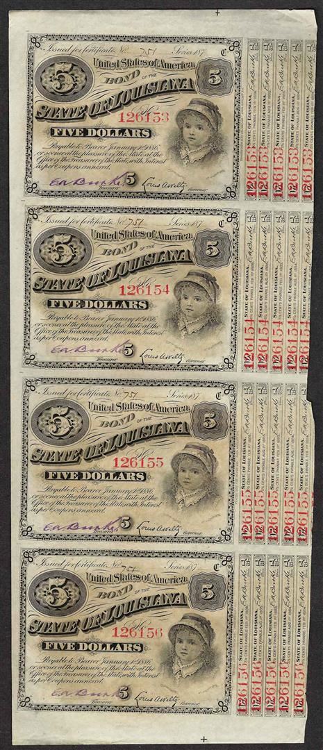 One Uncut Sheet of (4) State of Louisiana Baby Bond Obsolete Notes.