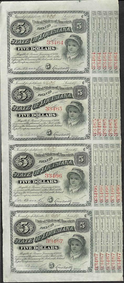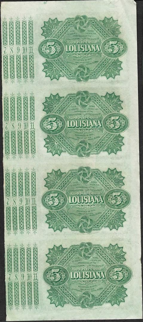 Uncut Sheet of (4) State of Louisiana Baby Bond Obsolete Notes