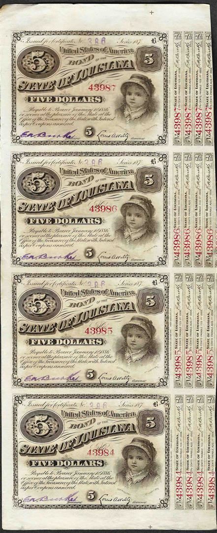 Uncut Sheet of (4) State of Louisiana Baby Bond Obsolete Notes