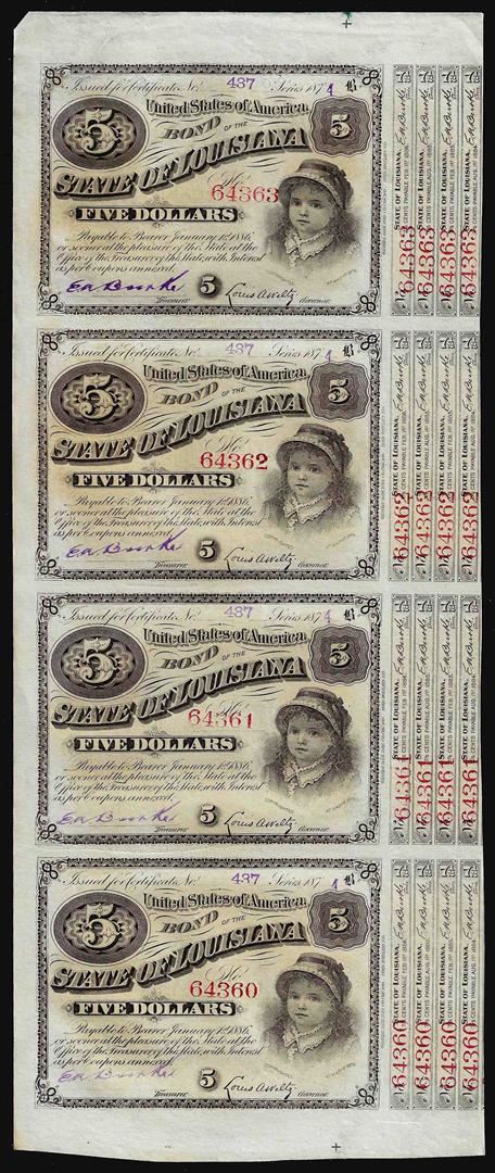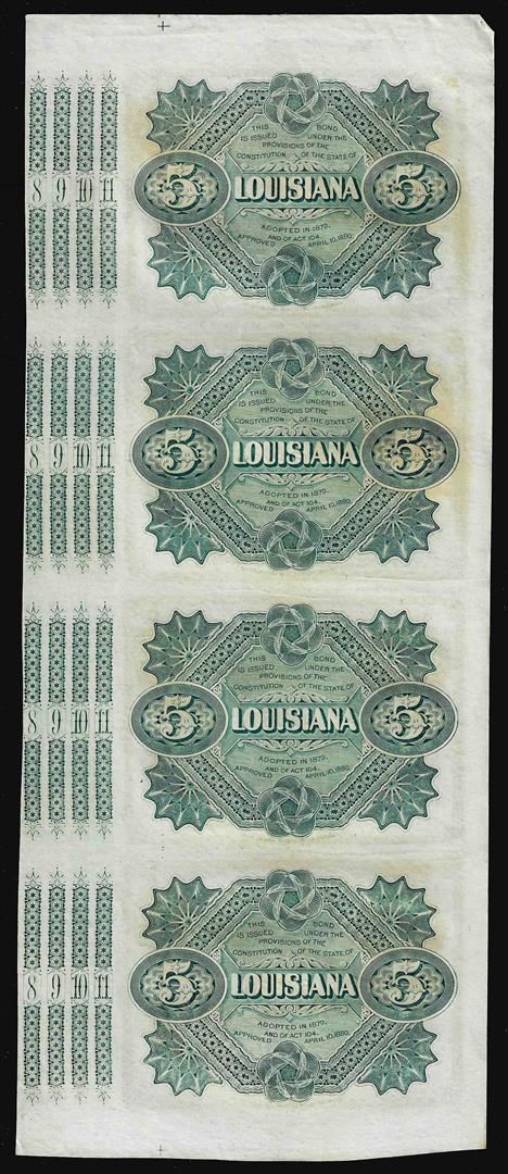 Uncut Sheet of (4) State of Louisiana Baby Bond Obsolete Notes