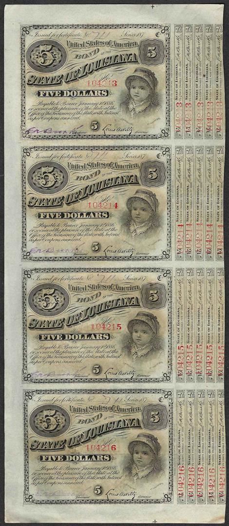 Uncut Sheet of (4) State of Louisiana Baby Bond Obsolete Notes