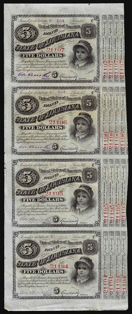 Uncut Sheet of (4) State of Louisiana Baby Bond Obsolete Notes