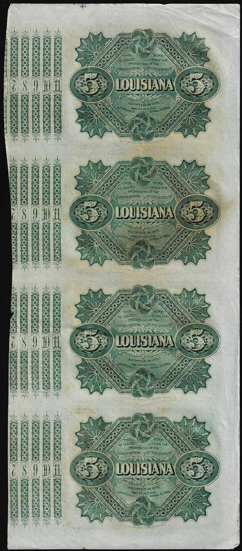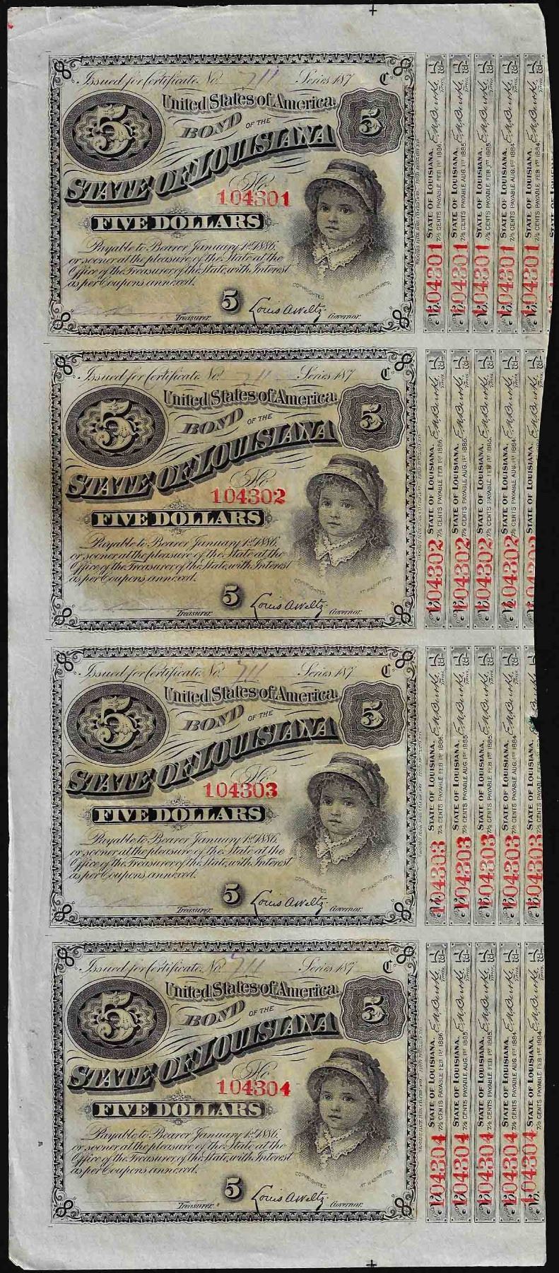One Uncut Sheet of (4) State of Louisiana Baby Bond Obsolete Notes.