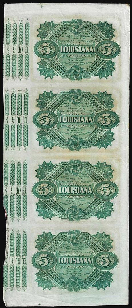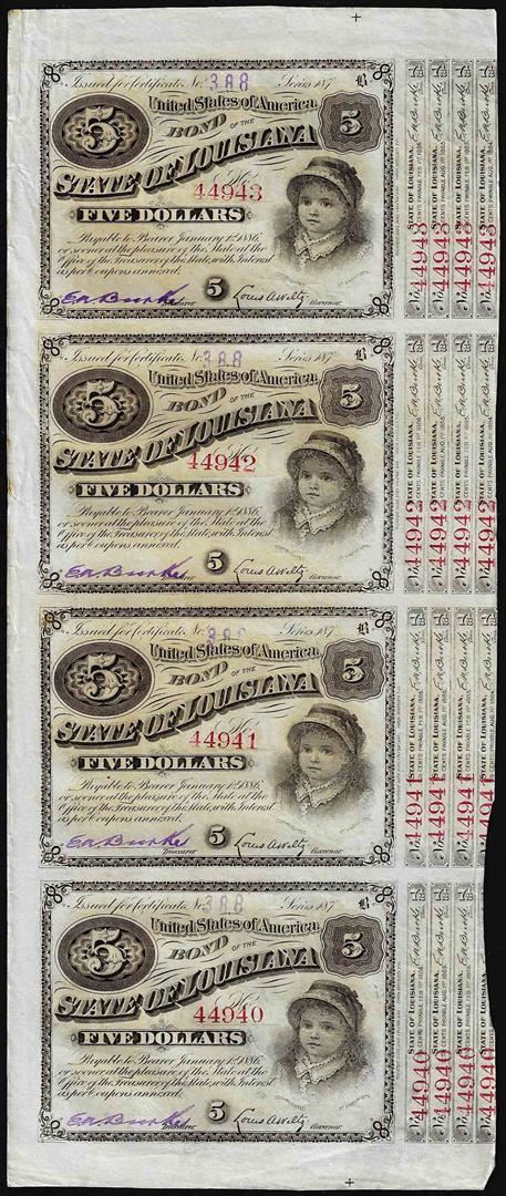 Uncut Sheet of (4) State of Louisiana Baby Bond Obsolete Notes