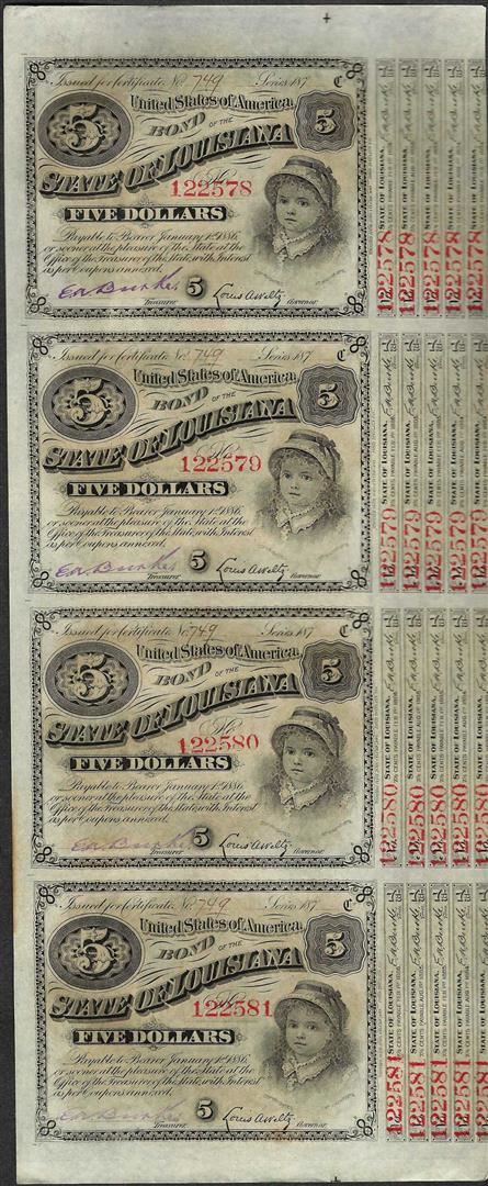 One Uncut Sheet of (4) State of Louisiana Baby Bond Obsolete Notes.