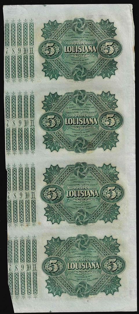 One Uncut Sheet of (4) State of Louisiana Baby Bond Obsolete Notes.
