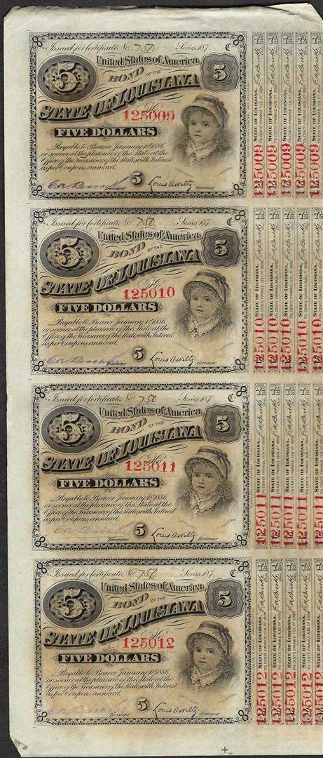 Uncut Sheet of (4) State of Louisiana Baby Bond Obsolete Notes