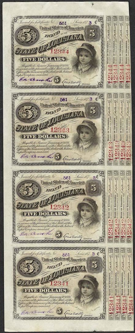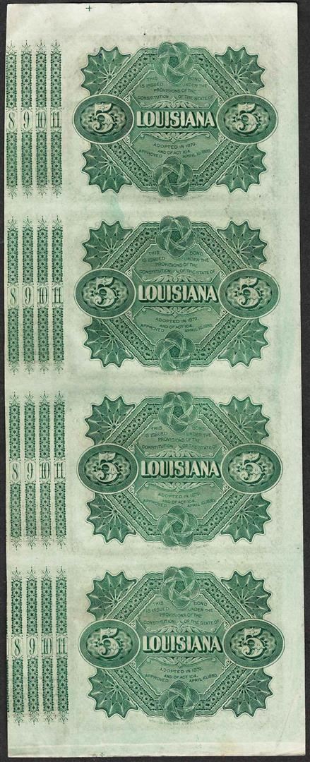One Uncut Sheet of (4) State of Louisiana Baby Bond Obsolete Notes.