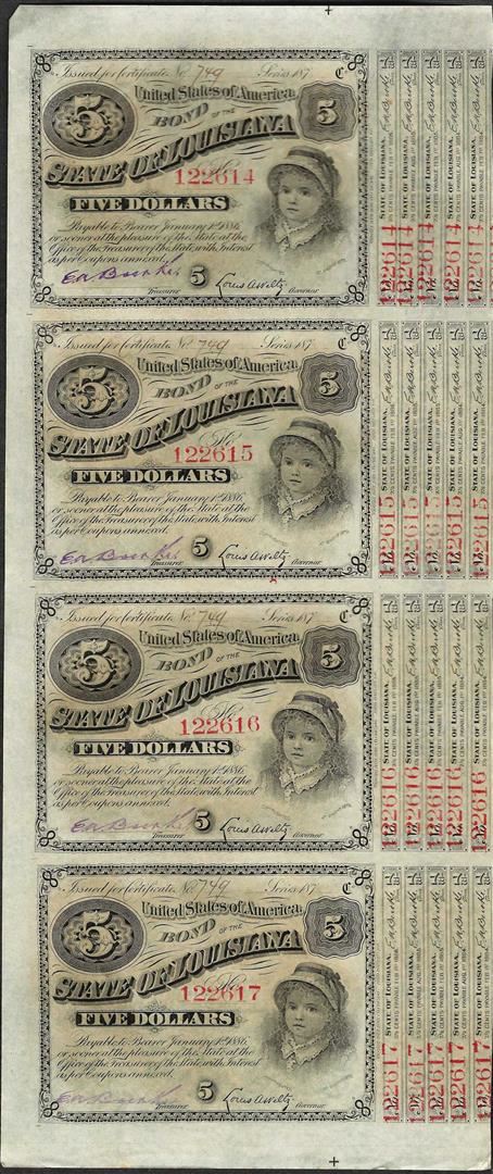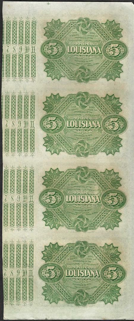 Uncut Sheet of (4) State of Louisiana Baby Bond Obsolete Notes