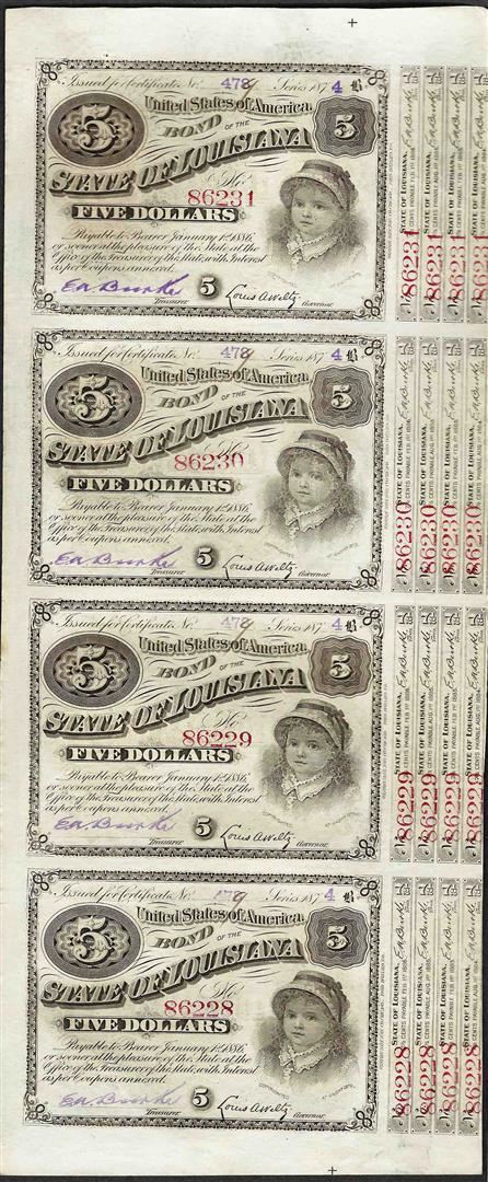 Uncut Sheet of (4) State of Louisiana Baby Bond Obsolete Notes