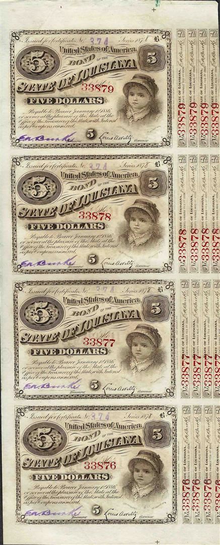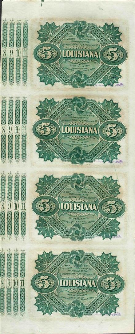 Uncut Sheet of (4) State of Louisiana Baby Bond Obsolete Notes