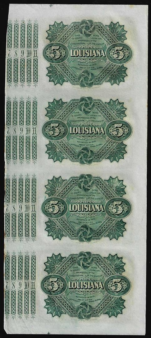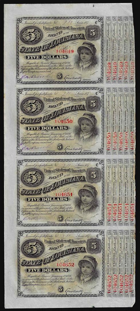 Uncut Sheet of (4) State of Louisiana Baby Bond Obsolete Notes