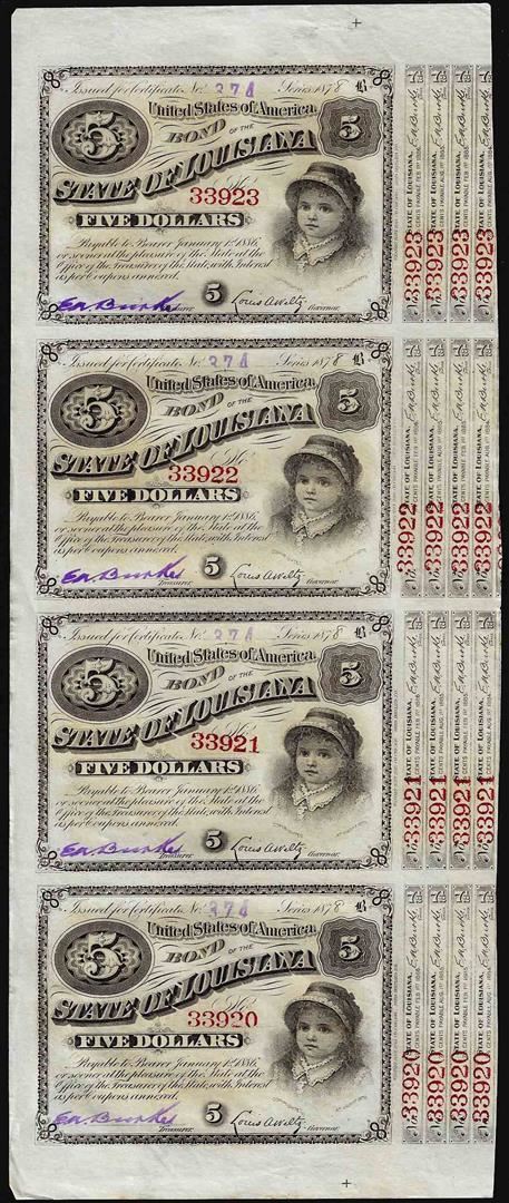 One Uncut Sheet of (4) State of Louisiana Baby Bond Obsolete Notes.