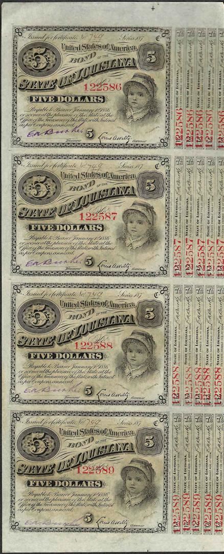 Uncut Sheet of (4) State of Louisiana Baby Bond Obsolete Notes