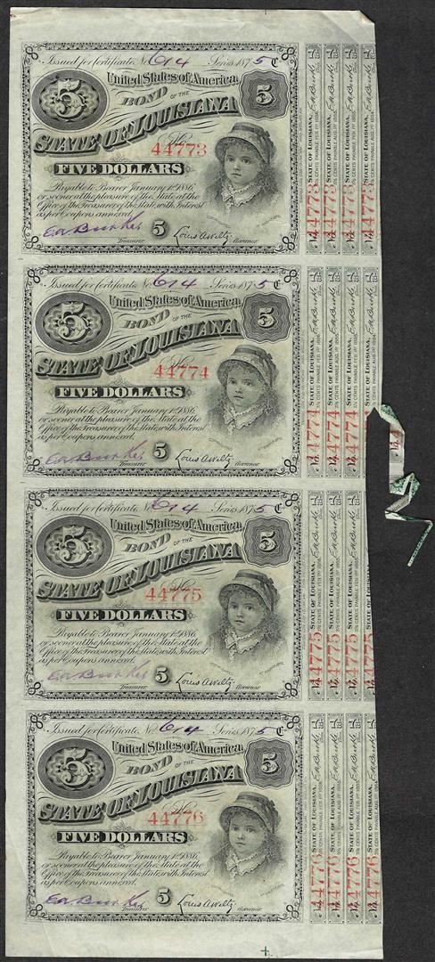 Uncut Sheet of (4) State of Louisiana Baby Bond Obsolete Notes