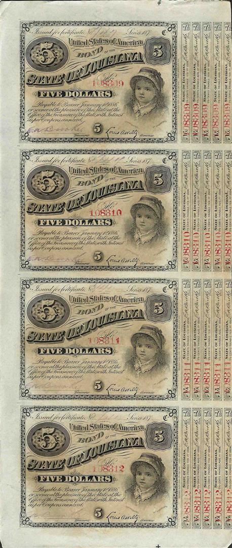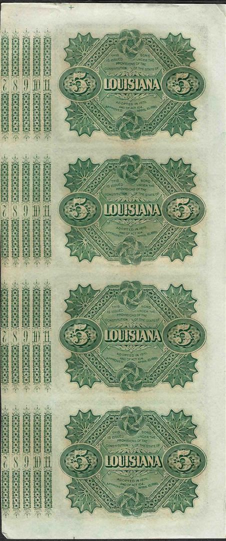 Uncut Sheet of (4) State of Louisiana Baby Bond Obsolete Notes