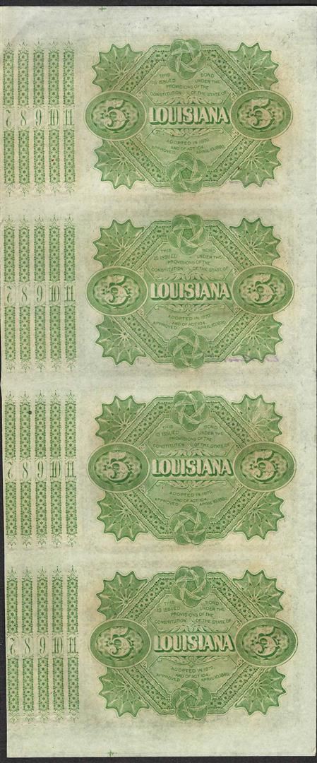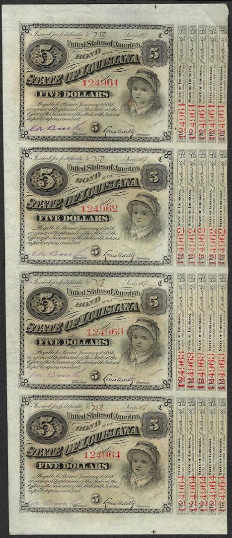 Uncut Sheet of (4) State of Louisiana Baby Bond Obsolete Notes