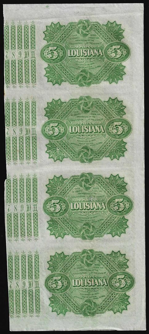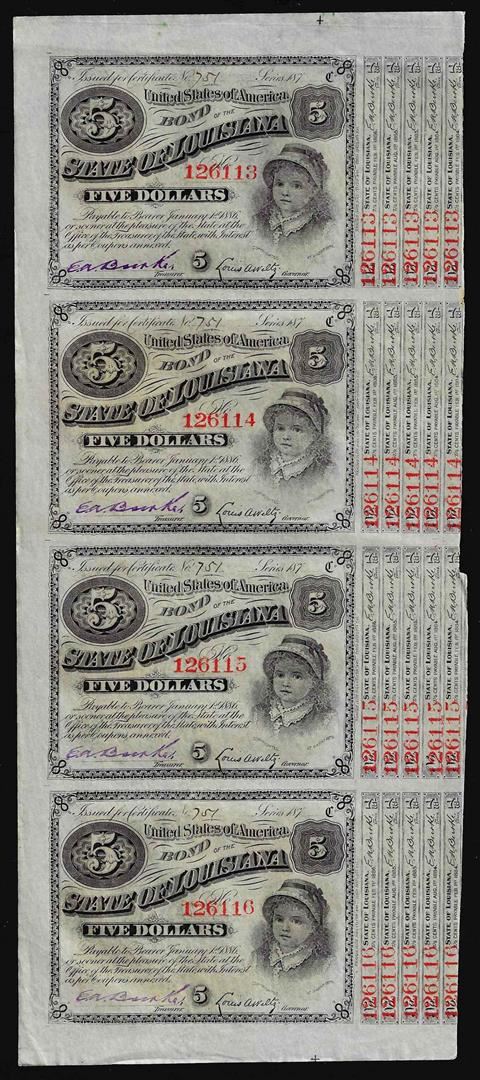 One Uncut Sheet of (4) State of Louisiana Baby Bond Obsolete Notes.