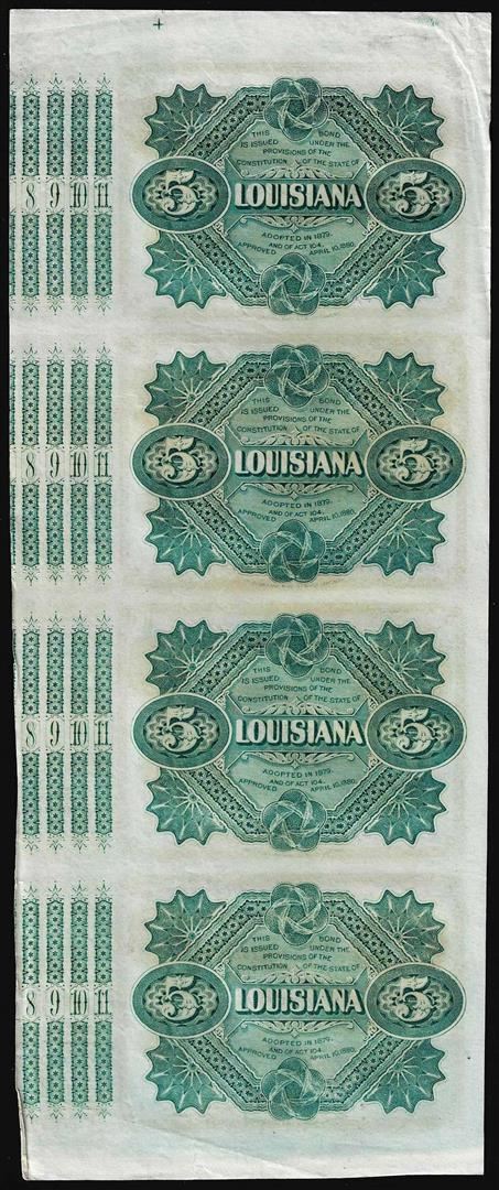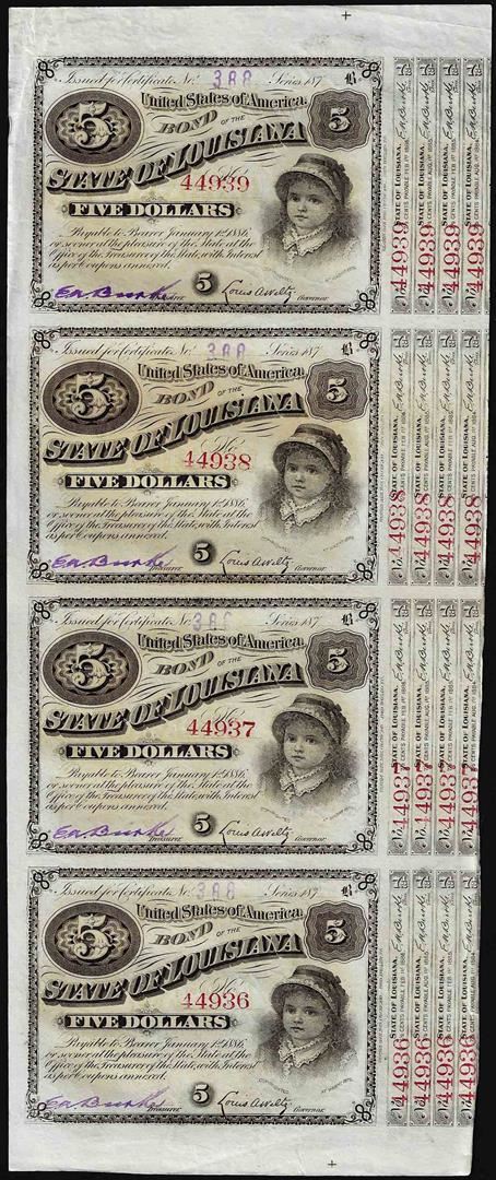Uncut Sheet of (4) State of Louisiana Baby Bond Obsolete Notes