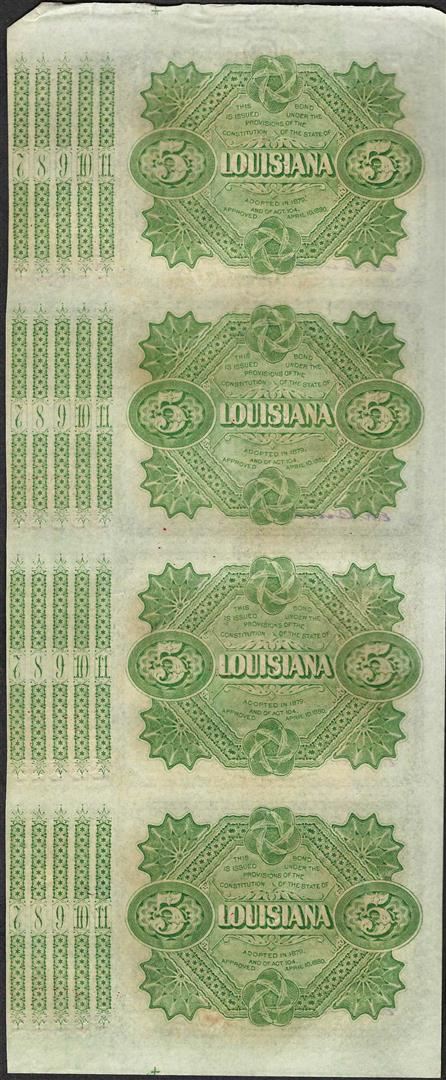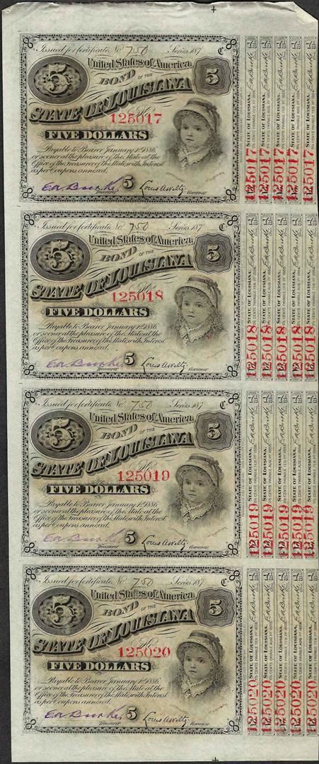 Uncut Sheet of (4) State of Louisiana Baby Bond Obsolete Notes