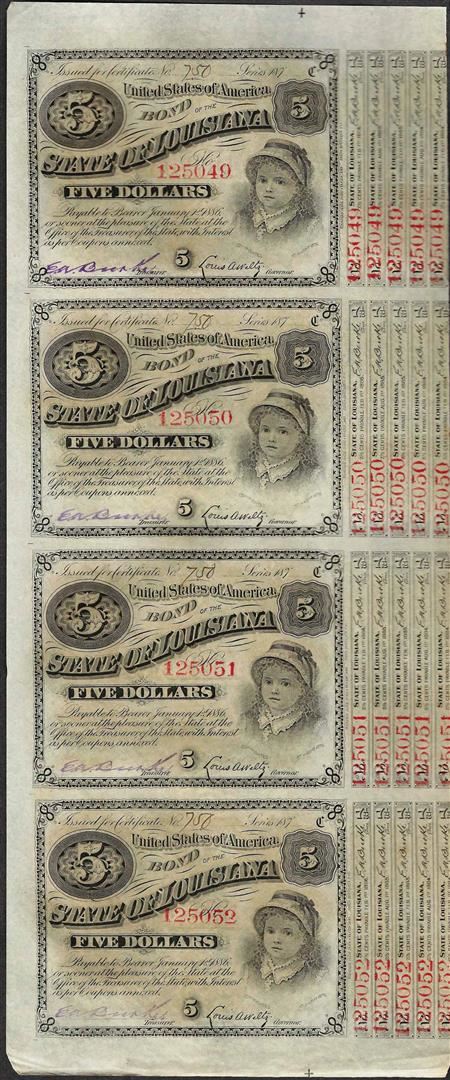 Uncut Sheet of (4) State of Louisiana Baby Bond Obsolete Notes