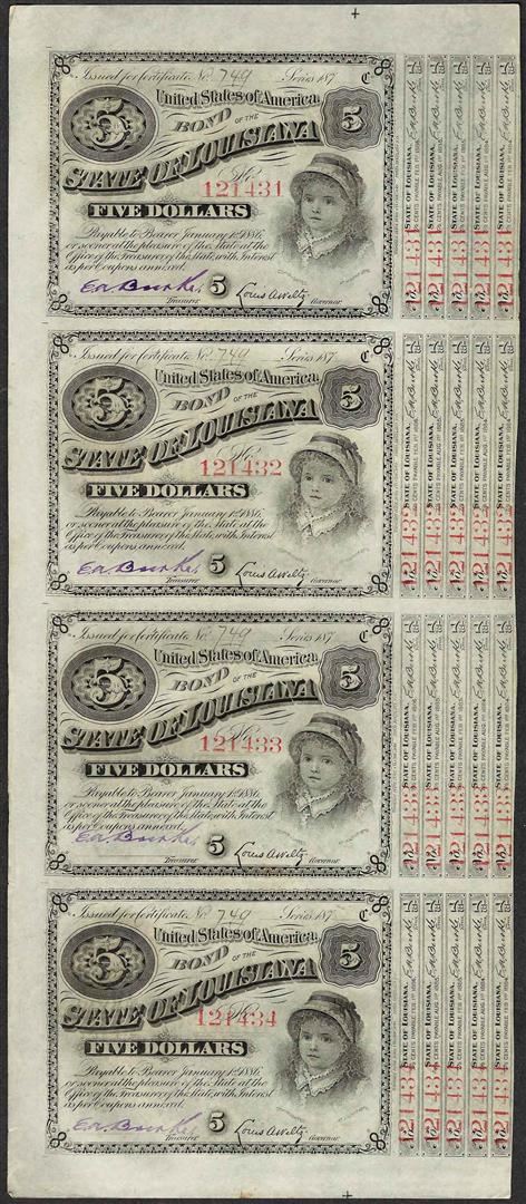 One Uncut Sheet of (4) State of Louisiana Baby Bond Obsolete Notes.