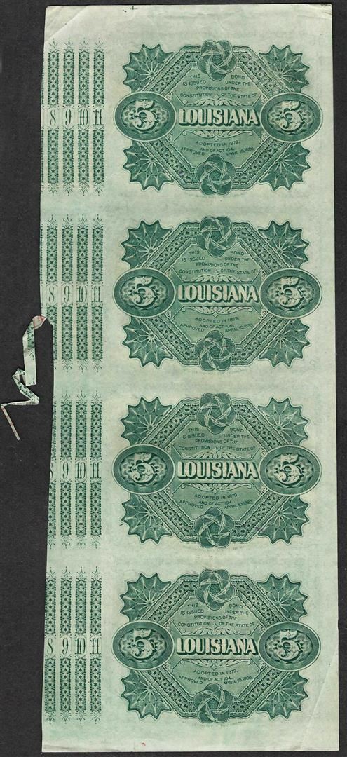 Uncut Sheet of (4) State of Louisiana Baby Bond Obsolete Notes