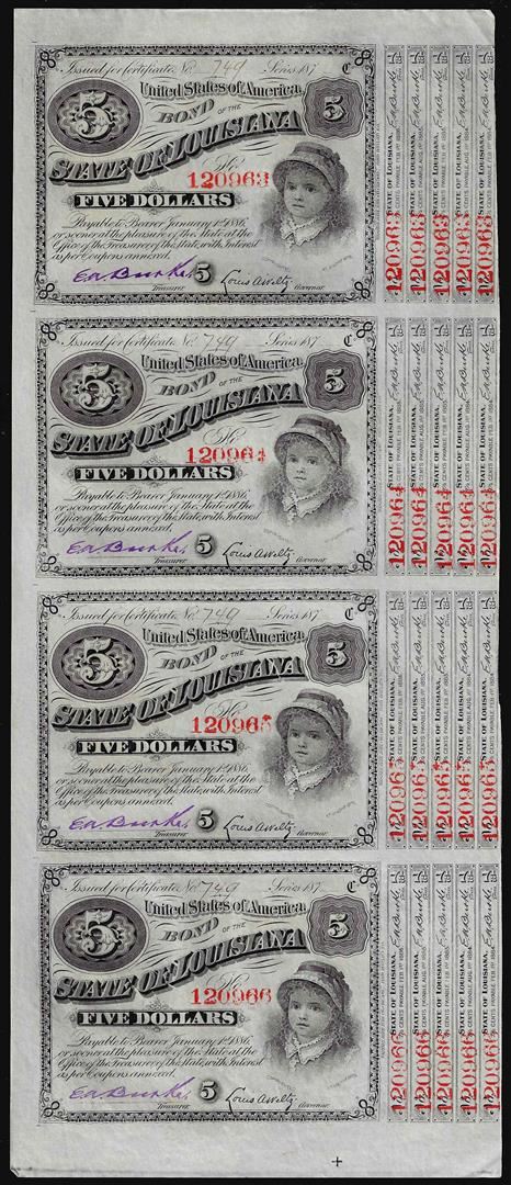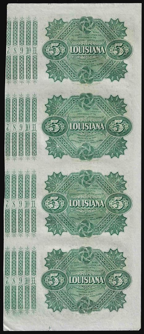 Uncut Sheet of (4) State of Louisiana Baby Bond Obsolete Notes