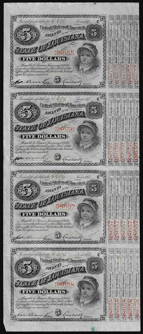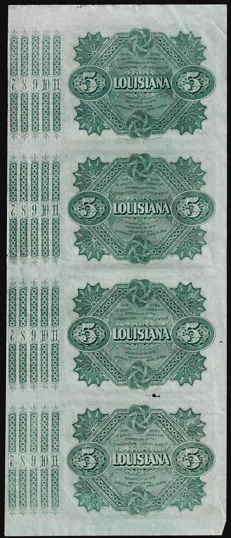 Uncut Sheet of (4) State of Louisiana Baby Bond Obsolete Notes