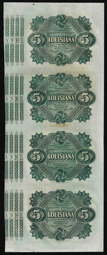 Uncut Sheet of (4) State of Louisiana Baby Bond Obsolete Notes