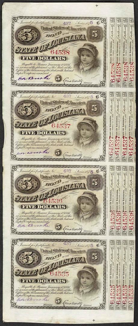 Uncut Sheet of (4) State of Louisiana Baby Bond Obsolete Notes