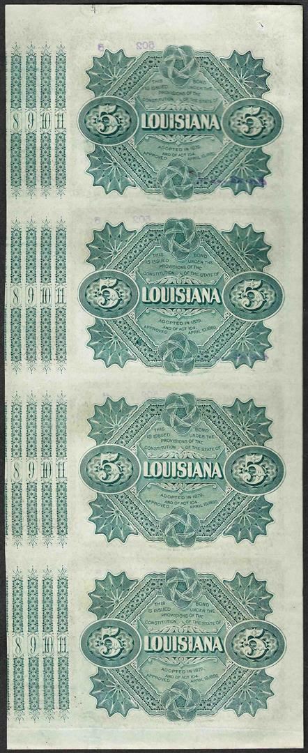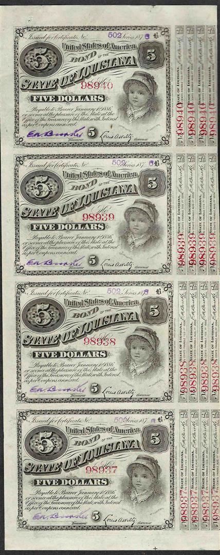 Uncut Sheet of (4) State of Louisiana Baby Bond Obsolete Notes