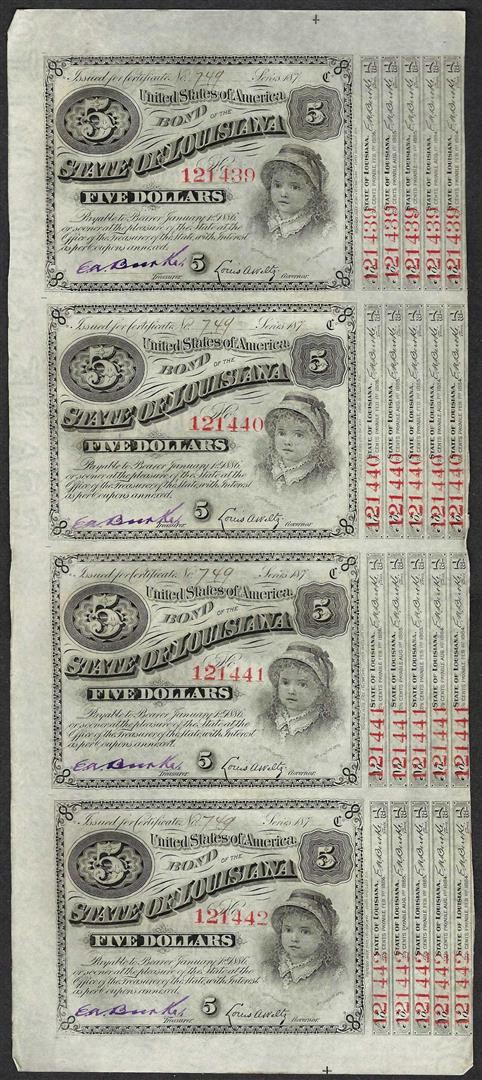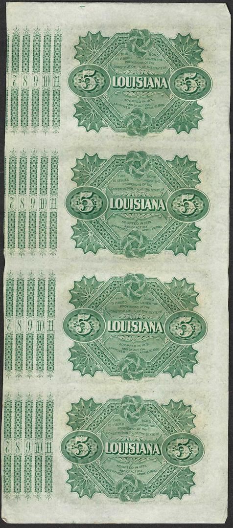 Uncut Sheet of (4) State of Louisiana Baby Bond Obsolete Notes