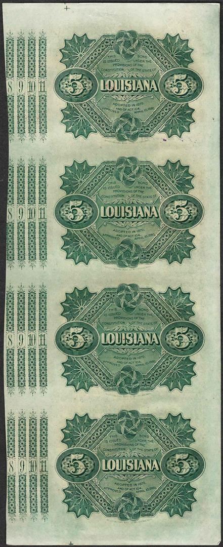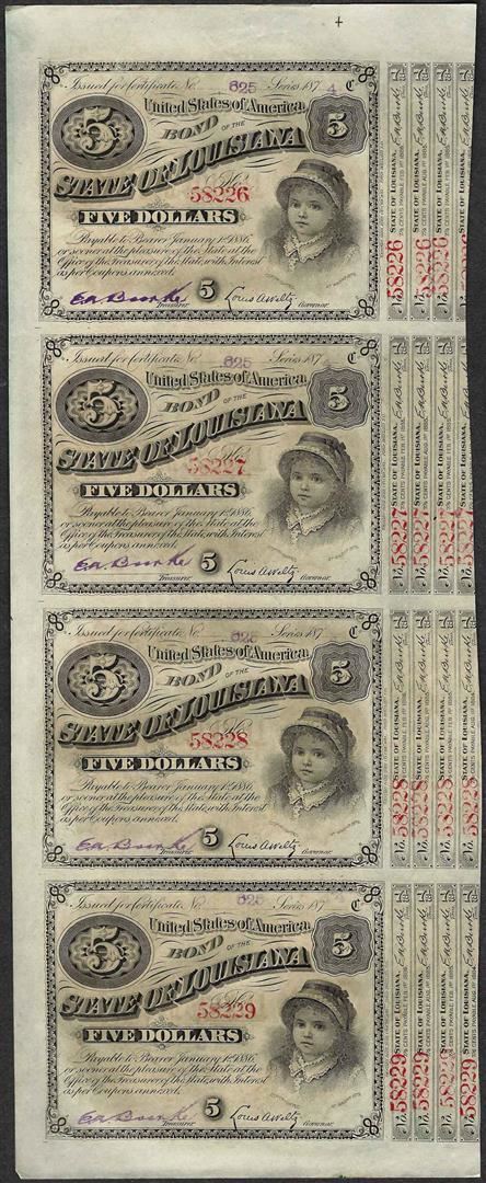 Uncut Sheet of (4) State of Louisiana Baby Bond Obsolete Notes