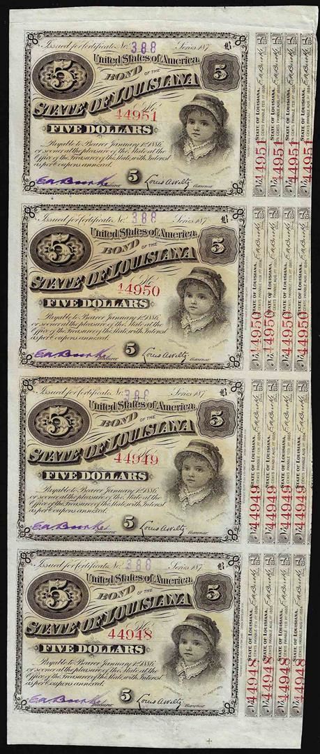 Uncut Sheet of (4) State of Louisiana Baby Bond Obsolete Notes