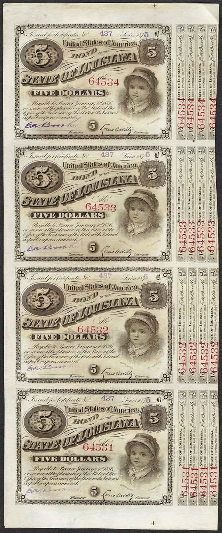 Uncut Sheet of (4) State of Louisiana Baby Bond Obsolete Notes