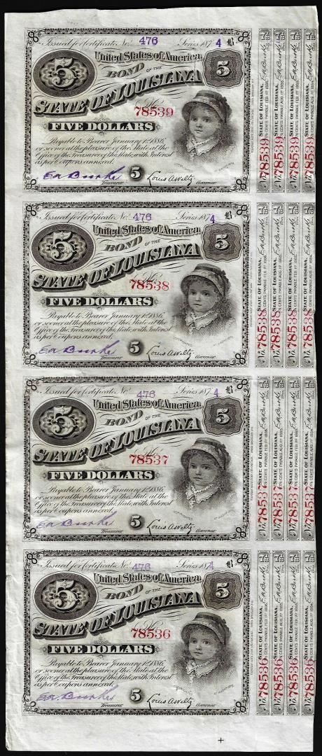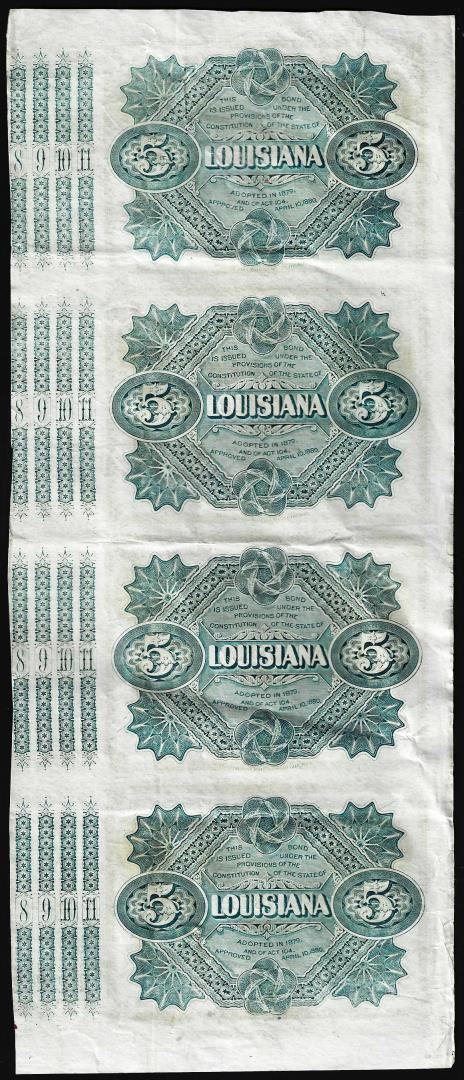 One Uncut Sheet of (4) State of Louisiana Baby Bond Obsolete Notes.