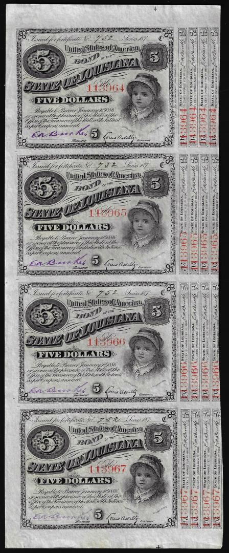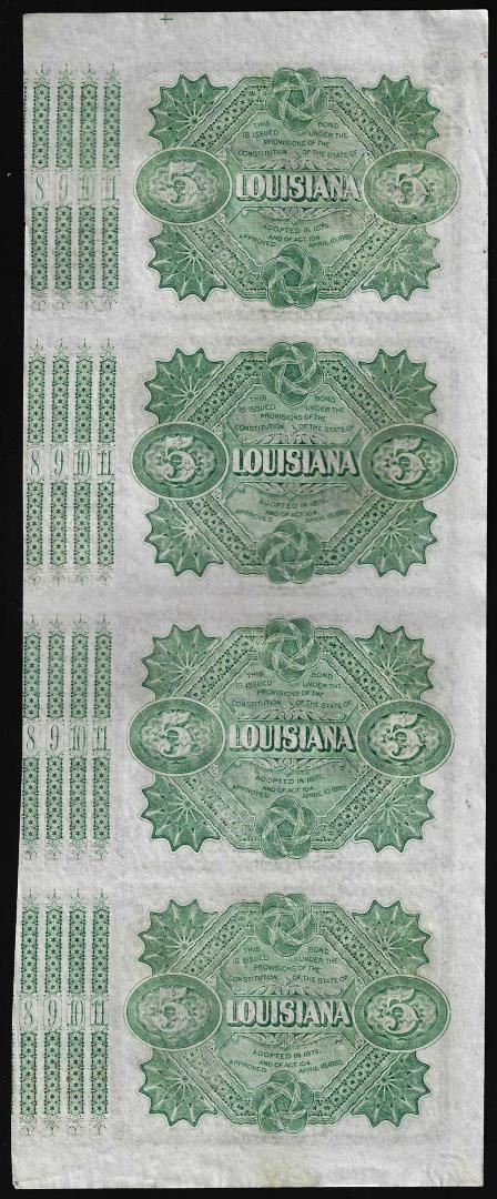 Uncut Sheet of (4) State of Louisiana Baby Bond Obsolete Notes